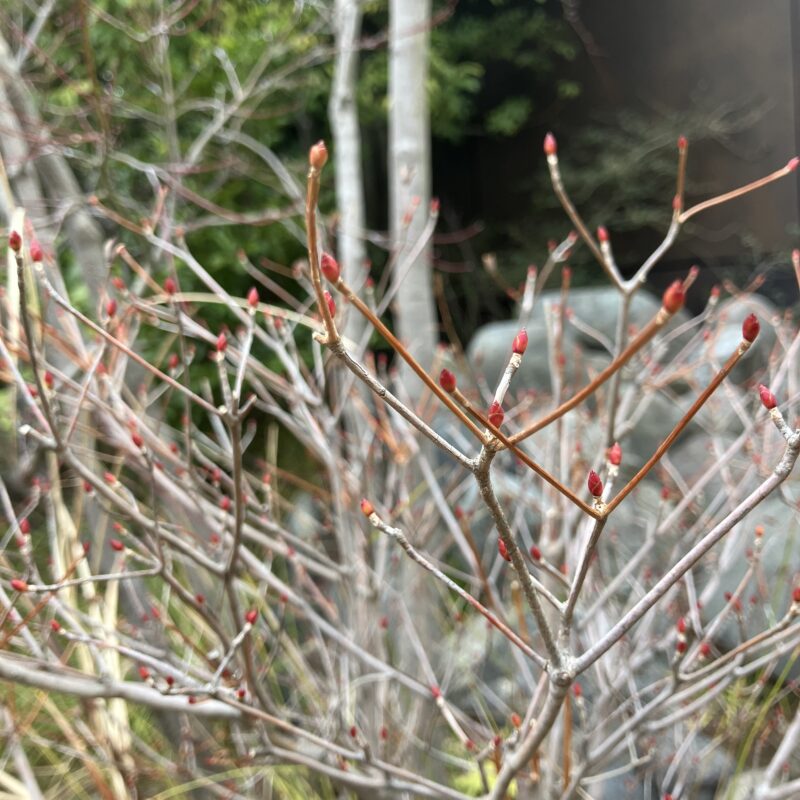 葉をすっかり落とした細い枝先に、ちょこんと行儀よく並ぶ粒々の冬芽。春にむけエネルギーを抱えこんでいます。ほんのり紅をさしたような色合いは、冬の澄んだ空気の中でいっそう鮮やかに映えます。(5階にて撮影)
