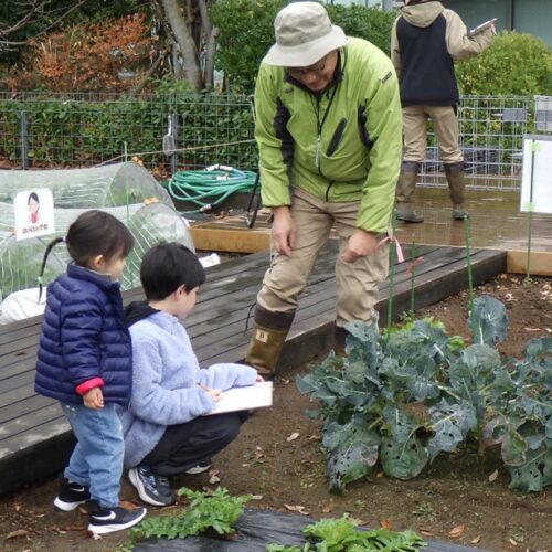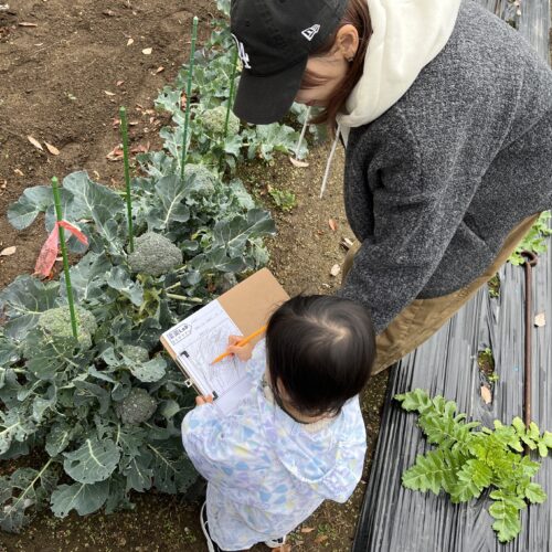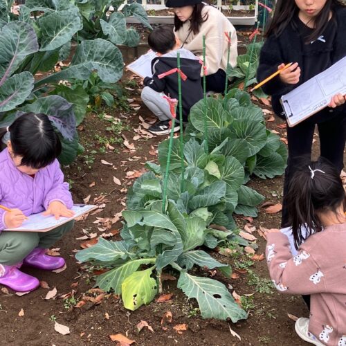 最初に、9月に作成した観察シートを使って、菜園の野菜の観察会を行いました。