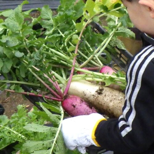 カゴ一杯に収穫したダイコンは、葉っぱも美味しいけれど、希望者には葉っぱを落として持ち帰っていただきました。