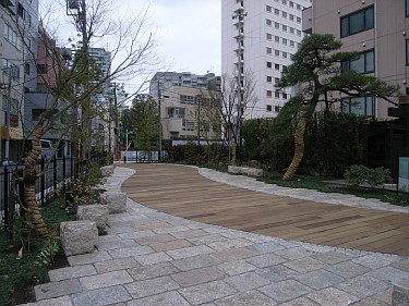 ![]() 歩道部分は、枕木舗装、両側は御影石舗装となっています。
