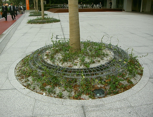 丸ビルの屋上庭園(リニューアル)は、かご(金網)を使って施工しています。